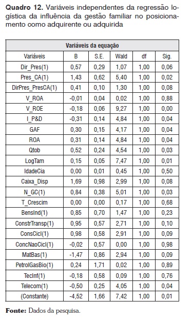 Os resultados da regressão logística revelaram que um membro da família ocupando o cargo de diretor presidente, o cargo de presidente do conselho de administração, ou ainda, quando os dois cargos estavam sob domínio da família, respectivamente, influenciavam a opção para o posicionamento ativo, ou seja, como adquirente em fusões e aquisições. Esses resultados coadunam com as constatações já destacadas no referencial teórico deste estudo.