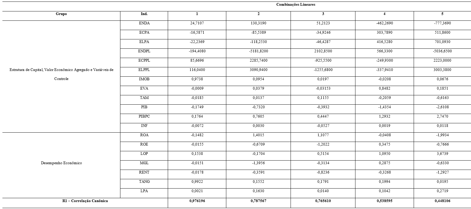 Conforme observado na primeira coluna da Tabela 7, sete combinações lineares diferentes puderam ser calculadas, visto que este é o número do conjunto de variáveis do primeiro grupo (Estrutura de Capital, Valor Econômico Agregado e variáveis de controle), sendo maior que o conjunto de variáveis do segundo grupo (desempenho econômico).