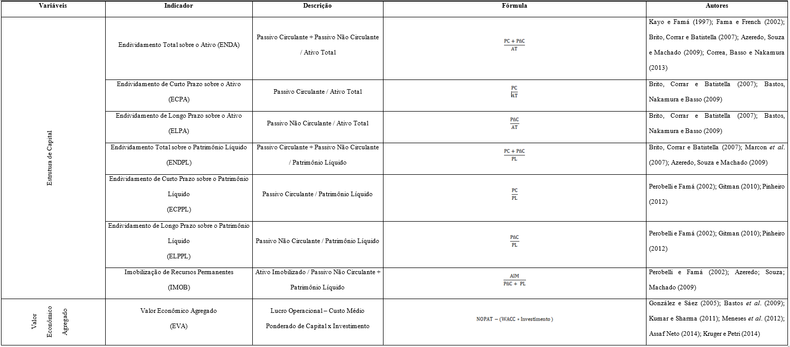 Os dados para análise foram obtidos no sítio da Thomson One Banker™ cuja coleta ocorreu entre os meses de novembro de 2014 e janeiro de 2015. Para a definição das variáveis procurou-se abranger aquelas que podem explicar a relação da Estrutura de Capital e do Valor Econômico Agregado no desempenho econômico de empresas industriais brasileiras e chilenas. O Quadro 2 apresenta as variáveis da Estrutura de Capital e do Valor Econômico Agregado.