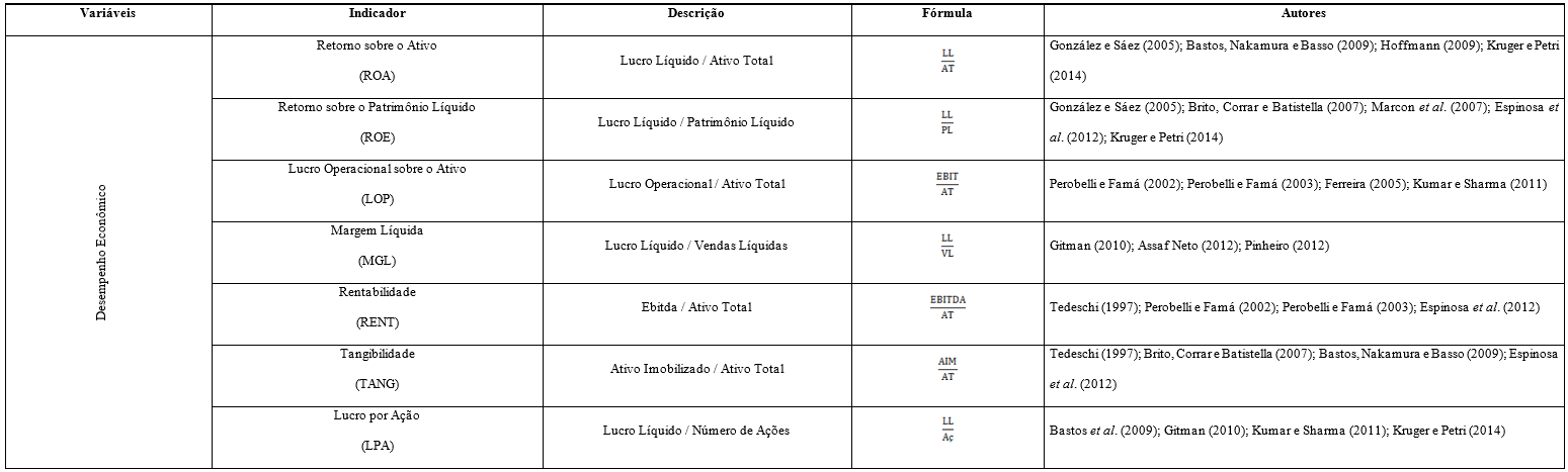 Para estabelecer o desempenho econômico em empresas industriais brasileiras e chilenas, utilizaram-se os indicadores de rentabilidade. As variáveis foram selecionadas a partir de estudos anteriores. Sendo assim, as variáveis que demonstram o desempenho econômico são apresentadas no Quadro 3.