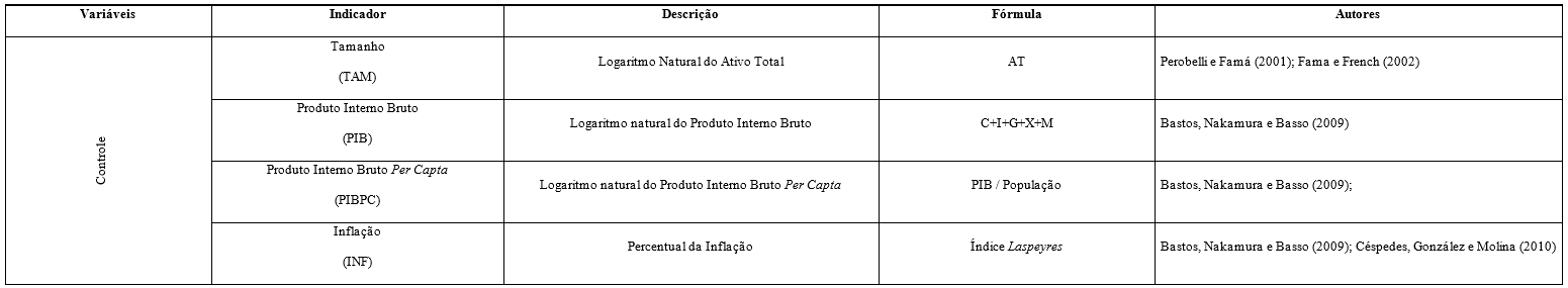 Para a realização desta pesquisa, foram adicionadas variáveis de controle. Conforme Lakatos e Marconi (2011) variável de controle é um fator, fenômeno ou propriedade que o investigador neutraliza ou anula propositalmente em uma pesquisa, com a finalidade de impedir que interfira na análise da relação entre as variáveis estudadas. Isto posto, as variáveis de controle foram selecionadas com base na possível relação com as variáveis de desempenho econômico. Caso as variáveis de controle possam ter forte relação com alguma destas variáveis e sejam omitidas na análise, a relação entre as variáveis de interesse pode não ser evidenciada de forma correta. As variáveis de controle são apresentadas no Quadro 4.