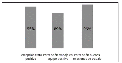 En la Figura 6 se observa que el 95 % tiene una percepción de trato positivo por parte de su jefe, el 89 % percibe que existe trabajo en equipo y el 96 % percibe buenas relaciones de trabajo. Es así como los encuestados consideran que tienen buenas relaciones con los compañeros de trabajo o los jefes.