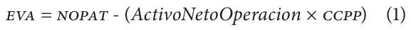 También se puede calcular el EVA determinando el activo neto de operación (diferencia entre el activo operativo y proveedores de bienes y servicios) y multiplicarlo por el spread del EVA, este último se obtiene calculando el rendimiento sobre el activo neto de operación, también conocido como ROIC (NOPAT dividido sobre el activo neto de operación) menos el CCPP (Herrera, 2006).