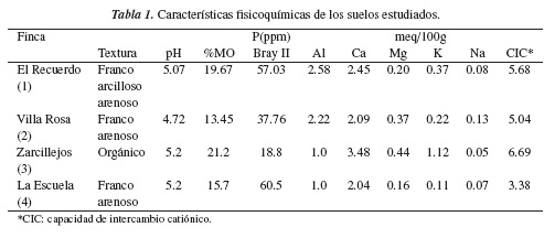 El muestreo de suelos se realizó en la vereda San José del Gacal, del municipio de Ventaquemada-Boyacá, que está localizada en inmediaciones del páramo del Rabanal, a una altura de 3200 msnm. Estos suelos se caracterizan por presentar fuerte acidez y bajos niveles de fertilidad [3]. Se tomaron muestras de cuatro fincas cultivadas con papa (Solanum tuberosum), las cuales se recolectaron en diferentes puntos de los terrenos, separados por cinco metros, realizando un desplazamiento en zig-zag. De cada finca se tomaron diez muestras de suelo rizosférico, las cuales fueron homogeneizadas y divididas en tres submuestras compuestas que fueron almacenadas en refrigeración y transportadas al laboratorio para su análisis microbiológico. Para determinar las características fisicoquímicas de los suelos se tomó una muestra compuesta de cada terreno, y los resultados se pueden evidenciar en la tabla 1.