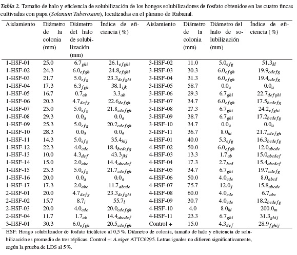Las actividades solubilizadoras de los hongos en estudio oscilaron entre 30.3 mgPO4/L, para el aislamiento 3-HSF-04, y 1370.6 mgPO4/L, para el aislado 2-HSF-02, cuya concentración es superior a la reportada para el control positivo del experimento, que fue de 1073.3 mgPO4/L (tabla 3). Los valores tan altos registrados por los aislamientos de este estudio podrían explicarse por el tiempo de incubación de estos ensayos, que fue de 14 días, mayor al reportado por otros estudios que evaluaron la cantidad de fosfato solubilizado por microorganismos en dos o diez días [9, 29].