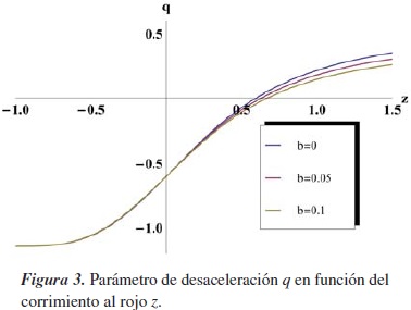 como se puede apreciar en la figura 3, para el parámetro de desaceleración los valores de b considerados aquí generan valores del corrimiento al rojo de transición zt entre 0,6 y 0,7, aproximadamente, lo cual es consistente con el valor observado (zt ≈0,67) [14]. Hay que recordar que los valores positivos de q corresponden a un régimen de expansión desacelerada (dominancia de materia), y los negativos, a un régimen de expansión acelerada (dominancia de la energía oscura), y la transición de un regimen al otro se da en zt.