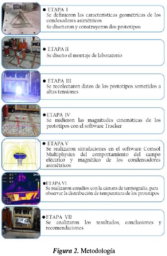 Se realizaron modelos experimentales para un análisis cinemático y simulaciones para observar el campo eléctrico y magnético, y, por último, se hicieron estudios de termografía de los condensadores asimétricos, con el fin de realizar un análisis cuantitativo y cualitativo del fenómeno de levitación electromagnética, comparando el comportamiento que se presenta con cada tipo de señal (AC y DC). Como resultado, el condensador asimétrico sometido a 30 kV en corriente directa presentó una levitación estable, en comparación con la señal en corriente alterna.