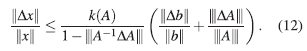la cual es una cota más débil pero más fácil de calcular. Además, esta cota tiene las mismas características y consecuencias que (10), y si la matriz de coeficientes del sistema de ecuaciones lineales está bien condicionada, entonces, el error relativo en la solución tiene el mismo orden que el error relativo de los datos.