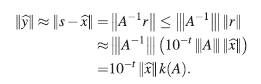 en donde la norma matricial usada para calcular el número de condición es la inducida por la norma vectorial ||·||. En un problema bien condicionado el error relativo en la solución es del mismo orden que el tamaño relativo del residuo; en un problema mal condicionado, sin embargo, una solución calculada que produce un residuo pequeño puede todavía estar lejos de la solución exacta.