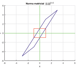 Ahora bien, en la Figura 1, se observan dos gráficas. En color rojo se representan los vectores unitarios con la norma ||·||∞, y en color azul se representan los vectores Z = MX, en donde X es unitario; es decir, la gráfica en color azul representa la imagen bajo M de los vectores de la gráfica en color rojo. Ahora, si para cada vector Z del gráfico en azul, se calcula ||Z||∞ y se toma la máxima de estas normas, es posible ver, que para el ejemplo se tiene que la norma máxima es igual a 6, y se concluye que |||M||| = 6, donde |||·||| es la norma inducida por ||·||∞.
