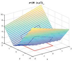 Por otra parte, en la Figura 2 se aprecian tres elementos. El primero está en el plano xy, con color rojo y representa los vectores U de ℝ2, tales que, ||U||∞ = 1; el segundo elemento es la superficie,