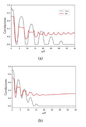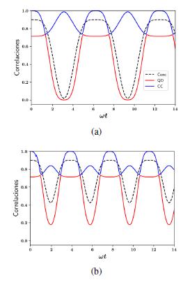 Este efecto es similar al que se obtuvo en [3] donde consideran interacción unifotónica. La evolución de la concurrencia (línea de color negro discontinua) es periódica pero se mantiene constante en lapsos de tiempos cortos, indicando que los qubits se encuentran entrelazados de forma constante en esos intervalos de tiempo. Para la dinámica unifotónica (figura 2 a) el ancho de tiempo de congelamiento de las correlaciones es más grande que en la dinámica bifotónica (figura 2 b). Sin embargo, cuando en nuestro sistema se consideran pérdidas unifotónicas o bifotónicas hacia el reservorio desde las cavidades, la amplitud disminuye tanto para la discordia como para en entrelazamiento como se muestra en la figura 3.