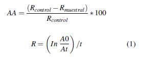 Tomando a R como la velocidad de degradación de la muestra control, A0 como la absorbancia de la muestra control en el tiempo cero y At como absorbancia de la muestra control en el tiempo t.