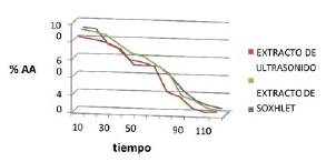 La evaluación de la actividad antioxidante (AA) reporto mayor porcentaje en el extracto de naranja valencia obtenido por Soxhlet, con respecto al extracto obtenido con ultrasonido y el estándar (ácido ascórbico), alcanzando un valor porcentual de 91, 333%, como se evidencia en la Tabla 6.