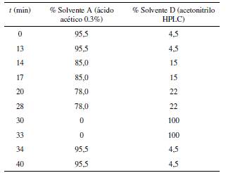 La determinación de compuestos fenólicos se realizó por cromatografía de alta eficiencia, en un cromató-grafo liquido (LC) Agilent Technologies 1200 Series (Palo Alto, California, EE.UU.), con un detector UV-Vis de arreglo de diodos (HPLC/DAD), a λ = 245 nm, La columna empleada en el análisis fue KINE-TEX (C18) (Phenomenex), 100 mm x 4.6 mm (d.i.) x 2.6 μm (tamaño de partícula), La inyección se realizó en modo automático (Viny = 10 μL), con gradiente de elución como se muestra en la Tabla 1. Para este análisis se tomó como referencia xantinas cafeína (Part N° C8960-250G, Sigma-Aldrich), teobromina (Part N° T4500-25G, Sigma-Aldrich) y teofilina (Part N° T1633-25G, Sigma-Aldrich); las catequinas (±)- catequina (C) (Part N° C1788-500MG, Sigma-Aldrich), (-)-epigalocatequina galato (EGCG) (Part N° E4143-50MG, Sigma-Aldrich), (-)-epicatequina (EC) (Part N° E1753-1G, Sigma-Aldrich), (-)-epicatequina galato (ECG) (Part N° E3893-10MG, Sigma-Aldrich), (-)- epigalocatequina (EGC) (Part N° E3768-5MG, Sigma-Aldrich); los flavonoides ácido caféico (Part N° C0625, Sigma-Aldrich), acido p-cumárico (Part N° C9008, Sigma-Aldrich), ácido rosmarínico (Part N° 536954-5G, Sigma-Aldrich), quercetina (Part N° Q4951-10G, Sigma-Aldrich), naringenina (Part N° N5893-1G, Sigma-Aldrich), luteolina (Part N° L9283-10MG, Sigma-Aldrich), kaempferol (Part N° K0133-50MG, Sigma-Aldrich), ácido ursólico (Part N° U6753-100MG, Sigma-Aldrich), pinocembrina (Part N° P5239, Sigma-Aldrich), ácido carnósico (Part N° C0609-10MG, Sigma-Aldrich) y apigenina (Part N° A3145-25MG, Sigma-Aldrich) a un flujo de 1 mL/min y temperatura de 35 °C.