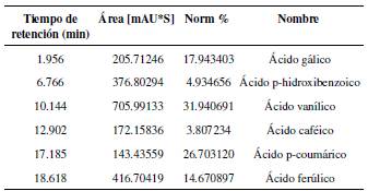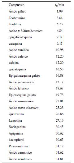 Para la determinación cualitativa de los compuestos fenólicos en las muestras se realizó la comparación de los tiempos de retención, t R los cuales se encuentran en la Tabla 2 y los espectros UV-Vis, utilizando una solución patrón de los ácidos fenólicos, xantinas, catequinas y flavonoides en una concentración conocida.