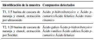 Los compuestos fenólicos determinados mediante la extracción por ultrasonido tratamiento T1 y extracción por Soxhlet tratamiento T2 se reportan a continuación en la Tabla 5.