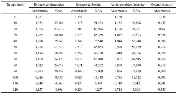 Un indicador importante para conocer las bondades antioxidantes de frutas y vegetales es el secuestro de radicales libres por polifenoles [16, 17], en este caso la actividad antioxidante se trabajó de acuerdo a la metodología de propuesta por [18], para lo cual se tomó 1 mL de solución de /3 -caroteno (0.4 mg/mL en cloroformo) evaporando hasta sequedad posteriormente se agregaron 0.02 mL de ácido linoleico, 0.2 mL de Tween 20 y 0.2 mL de los extractos crudos, agregándose 20 mL de agua oxigenada al 5%, se determinó su absorbancia a 470 nm, posterior a ello, las muestras se sometieron autooxidación térmica en baño a 50 °C, leyendo su absorbancia cada 10 minutos durante 120 minutos, preparando un estándar con ácido ascórbico y un control con metanol al 80%, además de un blanco con agua destilada. Para la evaluación de la actividad antioxidante en los extractos de la cáscara de naranja valencia se utilizó el método de decoloración del β -caroteno, en el cual, el valor de la actividad antioxidante se calculó teniendo en cuenta la ecuación propuesta por [19], como un porcentaje de inhibición relativa para el control, la actividad antioxidante (AA).