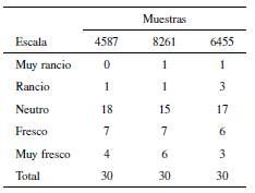 Para la evaluación estadística se utilizó el paquete SPSS y se aplicó una prueba T (análisis de factor), donde se le asignó un valor a cada termino, en el que 1 equivale a muy rancio, 2 a rancio, 3 a neutro, 4 a fresco y 5 a muy fresco, en la Tabla 7 se aprecian los resultados obtenidos.