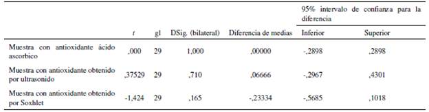 El análisis estadístico proporciono resultados que permitieron demostrar que para las tres muestras el promedio se encontró entre el rango neutro y fresco. Al comparar las muestras de antioxidante extraído de la cascara dela naranja valencia con respecto a la muestra control en la cual se empleó como antioxidante ácido ascórbico, el producto embutido con el extracto antioxidante obtenido por ultrasonido presento una diferencia promedio de 0,0666 a favor, mientras que en la muestra con antioxidante obtenido por Soxhlet fue de 0,23334 por debajo del control, como se evidencia en la Tabla 8.