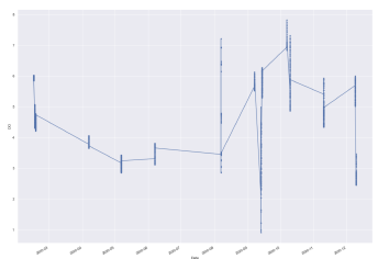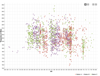 Figure 16 shows the relationship between temperature and the amount of dissolved oxygen. It is observed that the temperature in the range of 17 °C to 23 ° C influences water precipitation (synonymous with contamination). These scattered points also allow us to compare the behavior of the variables according to the geographical location since they change at all points.
