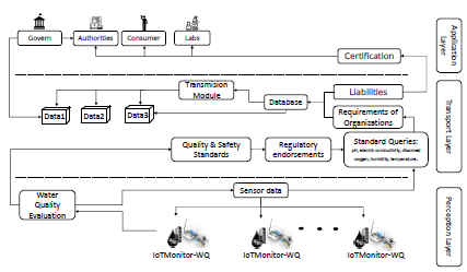 Figure 2 shows a system abstraction proposed by IoTMonitor-WQ. As we can see, this system based on these devices can deploy water traceability throughout the entire supply process. The ability to record and evaluate water quality variables, from the source to the consumer, has a very high impact on public health in any country. The quality requirements demanded by governments, world organizations dedicated to public health, and regional water supply centers laboratories can benefit from this type of technology. This system is designed from the perspective of the IoT architecture described in the figure above. The perception layer involves hardware deployment, network design, and technology interoperability. The transport layer requires adapting technologies, coordinating transmission processes, designing and configuring communication channels according to protocols, studying transparency and quality parameters of transmitted data, and other parameters related to the connection. The application layer involves deploying a visual and hosting service for the information collected and shipped from the hardware devices of the perception layer. In this layer, the entire logistical process of the system, including data in the form of statistics, alert parameters, and normality indicators, is made available to the user (government, entities, and consumers).