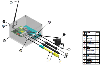 IoTMonitor-WQ sensors and peripheral elements are mounted on a PCB (70 x 100mm) that interconnects and polarizes the devices. The sensors are installed on the board according to the logical layout programmed in the system core (Lopy 1.0 Microcontroller). The PVC electrical housing containing the IoTMonitor-WQ system (x, y, z 140 x 100 x 150mm) houses; a LiPo lithium-ion battery (40 x 20 x 140mm), a communication antenna for the LoRa protocol, LED indicators, and four external adapters for the sensors (see Figure 5).