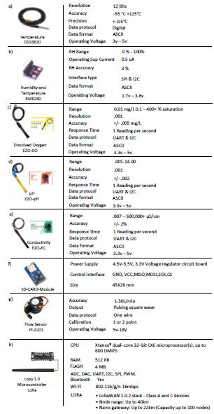 h) The central part of IoTMonitor-WQ is the Lopy 1.0 module. This microcontroller-based module has an adapted local flash memory module for local data storage. Lopy one is a compact network mycroPython enabled development board (Lora, Wifi, Bluetooth). This module has a direct link to a web platform where data is chronologically recorded.