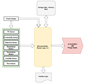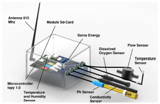 IoTMonitor-WQ consists of a Lopy one controller that develops the operational logic for acquiring each of the sensor signals and deploys the information transmission process with LoRa. The acquisition of signals concerning pH, electrical conductivity, and dissolved oxygen are AtlasScientific products [6, 10, 2, 8]. These sensors were chosen for their range of measurement accuracy and the support of the conditioning circuit included. IoTMonitor-WQ is a low-cost device with good technical specifications reliable in sampling, data transmission, and storage.