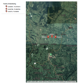 We installed IoTMonitor-WQ devices at three points along a water tributary that provides drinking water to a population to validate the system. The three points are georeferenced on the map in Figure 9. The idea is to analyze the water quality at these three points to trace the liquid. Figure 10 shows the internal detail of the IoTMonitor-WQ device while it is active and ready to be installed at the marked point.