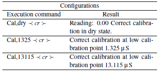 The electrical conductivity sensor is calibrated in a dry state in the first stage, connecting it to the LoPy microcontroller, and the calibration command is entered through the serial monitor. Table 2 shows that, for the second stage, once the calibration has been adjusted, the sensor is calibrated according to the specified standard substance for the low and high levels, obtaining a reference of 1,325 uS and 13,115 uS for the low and high points, respectively.