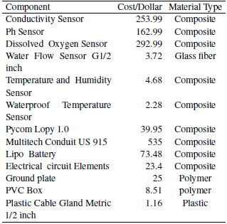The bill of materials in Table 4 shows a reduced list, which includes the main components and collections of parts needed to make IoTMonitor-WQ work for what it was designed to do. The primary device costs come from the sensors and the Lopy1.0 card, the LiPo lithium-ion battery, and the sd-card information storage module.