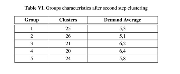 Then, the clustering algorithm was executed once again for each group so to be divided into more or less 25 clusters. Group characteristics are shown in Table VI where first columns identifies each group, second column represent the amount of clusters generated for each group and finally in third column the clusters' demand average is presented.