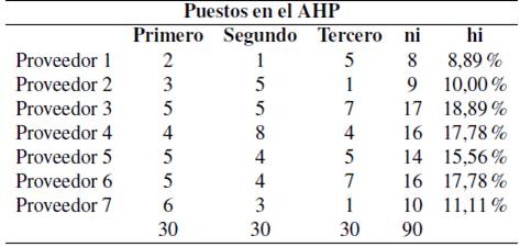 Según Ruiz, Mendoza y Ablanedo [17], para garantizar la confiabilidad del flujo de aprovisionamiento se debe utilizar una política de proveedores múltiples, con los cuales se minimiza la probabilidad de escasez y los efectos producidos al interior de la empresa cuando un proveedor falle; por tal razón, el AHP se realiza para preseleccionar los tres mejores proveedores de los siete presentados como ejemplo, esto se logra calculando y generando de forma simulada el conjunto de pesos o la importancia relativa de los criterios y las alternativas.
