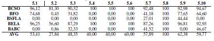 In the group 5, ABC, BFO, BSFLA AND BABC obtained optimal values, detailed as follows: ABC, four optimal values; BFO, three optimal values; BSFLA, four optimal values; BABC, two optimal values. BELA and BCSO did not achieve some optimum. The results are shown in the Table VI.