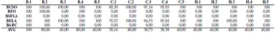 The results of groups B, C and H are shown in the Table VII where it is visualized that ABC achieves all the optimals for groups B and H, also achieving 2 optimal for group C. In relation to the other techniques used in the comparison, BFO finds two optimal values, BSFLA finds four optimal values. In the case of BABC, there are two optimal values. BCSO not get optimal as well as BELA.