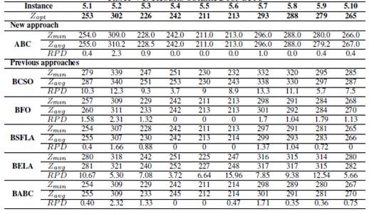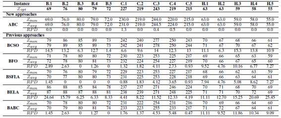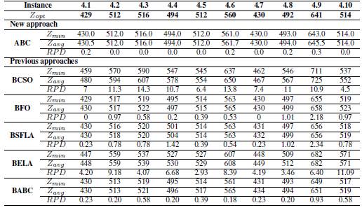 The table V show the results obtained for instances from group 4, where ABC had the best optimal values compared to the results by the previous approaches, only BFO exhibit a good performance for this data with two global optimums.