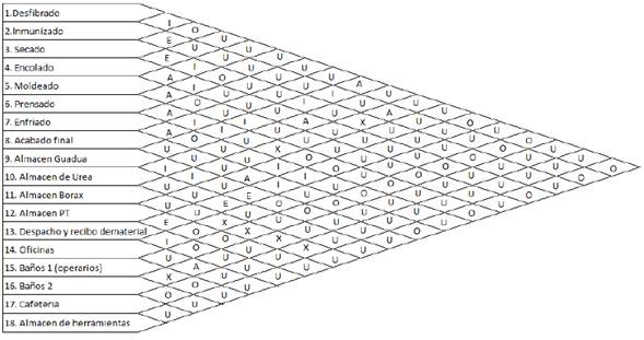 Al conocer la secuencia de actividades requeridas para la elaboración de vigas estructurales en GLG, se estableció el tipo y la intensidad de las interacciones existentes entre las mismas, los medios auxiliares, los sistemas de manipulación y los diferentes servicios de la planta de acuerdo con la importancia de la cercanía entre cada una de las áreas [11]. Teniendo en cuenta el flujo de materiales, información y restricciones de los elementos químicos utilizados en cada una de ellas,para ellos se realizó el diagrama relacional de actividades donde gráficamente se muestra como una matriz donde, al cruzarse las variables (áreas de la empresa), se generan unos niveles de importancia que vienen dados por los siguientes parámetros (Figura 2): A (absolutamente importante),E (especialmente importante), I (importante), O (importancia ordinaria), U (sin importancia), X (indeseable).