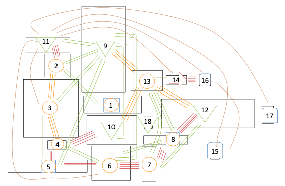 El diagrama relacional de recorridos es un gráfico en el que las áreas son representadas como nodos unidos por líneas. Estas últimas representan la intensidad de la relación (A, E, I, O, U, X) dada en el análisis de las relaciones entre actividades de acuerdo con el código de líneas (A cuatro líneas, E tres líneas, I dos líneas, X línea curva punteada). En este se detalla no solo el tipo de operación que se efectúa en cada área, sino que permite analizar el hecho de que efectivamente las relaciones tipo A, en su mayoría, se encuentran adyacentes y las de tipo X se encuentran separadas, por lo que cumplen el objetivo de la metodología SLP [8] (Figura 4).