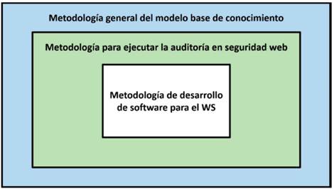 “Implementar metodologías y buenas prácticas en el tema de seguridad de la información”. Se logró establecer una metodología propia para el desarrollo del modelo propuesto, incluyendo metodologías ya definidas, métodos, buenas prácticas, técnicas, recomendaciones y tendencias actuales relacionadas con conceptos de base de conocimiento, auditoría de aplicaciones web, seguridad de la información y desarrollo de software.