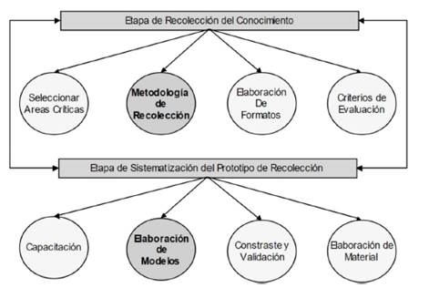 Esta sección constituye la definición metodológica general para el desarrollo del modelo en sus diferentes elementos; por lo tanto, se contextualizan varias investigaciones, artículos, trabajos y definiciones de los componentes esenciales al momento de realizar un análisis a los modelos de base de conocimiento. Este proyecto incluye dos tipos de metodologías de trabajo. La primera corresponde al diseño del prototipo del sistema recolección, procesamiento y depuración de la base de conocimiento para preparar el modelo prototipo. La segunda corresponde al proceso de sistematización del modelo de diagnóstico. Ambas metodologías tienen como soporte la investigación y, Figura 2. Metodología de desarrollo para la Base de Conocimiento Fuente: [7]. aunque se dan de manera simultánea, para efectos de presentación se analizan por separado (Figura2).