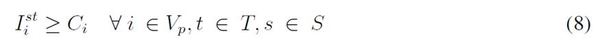 For each time period, each customer has a demand dtst i that is uncertain and is modeled with the scenario s ∈ S. The variable I st i represents the inventory levels at the depot and the customers, where each has a lower (Li) and upper (Ci) bound to be kept in inventory. Moreover, the depot must decide if there will be a delivery made by a vehicle represented by the set K, which has a specific capacity Qk, and each delivery is modeled with the variable q kt i . Finally, there are the binary variables Xkt ij and Y kt i , which determine if a customer is visited or not. This model considers uncertainty mainly with a two-stochastic optimization approach 19, where first-stage decisions are related to selecting visiting customers, second-stage decisions are related to inventory levels (customers/depot), and the decisions related to the amount of goods to be delivered to each customer per scenario. The mathematical model used is as follows: