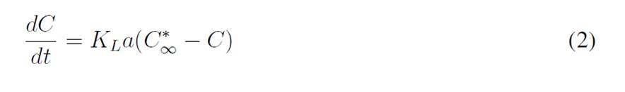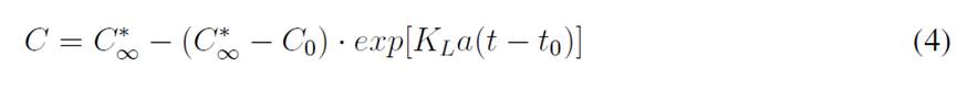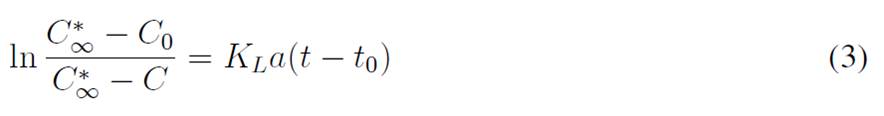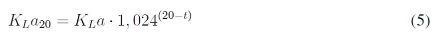 Las ecuaciones (3) y (4) se utilizan para pruebas en agua limpia en estado no estacionario, para determinar la capacidad de transferencia de diferentes equipos de aireación. Teniendo en cuenta que la temperatura del agua puede variar al momento de realizar la experimentación de transferencia de oxígeno, el coeficiente de transferencia de masa volumétrico KLa siempre debe ser convertido a temperatura estándar (t = 20° C) por medio de la siguiente ecuación: