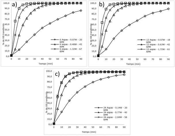Figura 2 Comportamiento en la transferencia de OD para los discos aireadores a) 6 aspas, b) 12 aspas y c) 24 aspas