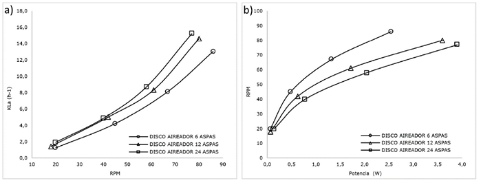 Los valores altos del coeficiente KLa obtenidos para el disco de 24 aspas pueden estar íntimamente relacionados con la intensidad y la cadencia de los impactos individuales provocados por las aspas durante el proceso de rotación 34;. La Figura 4b presenta la relación existente entre las RPM y la potencia consumida para cada uno de los sistemas estudiados. El sistema con disco de 6 aspas presenta una mayor cantidad de RPM, ya que se requiere una menor cantidad de potencia para hacer rotar el dispositivo, traducido en el consumo energético del sistema, así como una reducción en la resistencia generada por la inmersión y el arrastre generado por las aspas dentro del cuerpo de agua 30, 33. El resumen de todos los datos del proceso de aireación obtenidos en este estudio es presentado en la Tabla I. Los datos obtenidos de potencia fueron medidos en W, pero matemáticamente son expresados en kW.