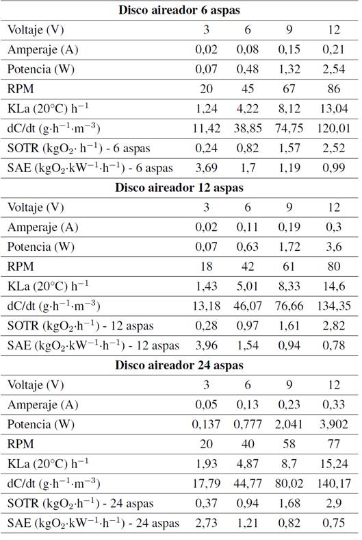 Los valores más altos del coeficiente KLa fueron de 15,24, 14,60 y 13,04, obtenidos para los discos de 24, 12 y 6 aspas, respectivamente. Por otra parte, los valores más altos de la SOTR fueron 2,90, 2,82 y 2,52 kgO2 ·h−1 para los discos de 24, 12 y 6 aspas. Por último, los valores más altos de SAE fueron de 0,99, 0,78 y 0.75 kgO2·kW−1 ·h−1 para los discos de 6, 12 y 24 aspas