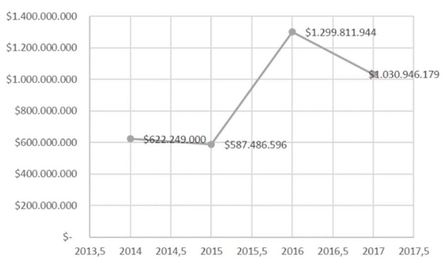 Como se muestra en la figura 3, la mayor inversión en el sector energético de la ciudad de Cali fue en el año 2016, con un total de $1.299.811.944 COP, lo que evidencia el interés de la Secretaría de Salud por el apoyo a medidas de eficiencia energética. Cabe destacar que la ciudad tiene la clínica más sostenible de Colombia, el Hospital de Cañaveralejo, que sirve como modelo para la generación de nuevos emprendimientos nacionales de sostenibilidad energética. En los años 2014 y 2015, el gobierno hizo una inversión del 48% y 45% del total invertido en el año 2016; ya para el año 2017 se evidencia un descenso de un 79% de inversión de capital con relación al valor mostrado en el año 2016, lo que muestra que, aunque se haya avanzado, se hizo un recorte, por ello las instituciones tienen que trabajar para demostrar al gobierno las necesidades en entidades que aún no han obtenido beneficios.