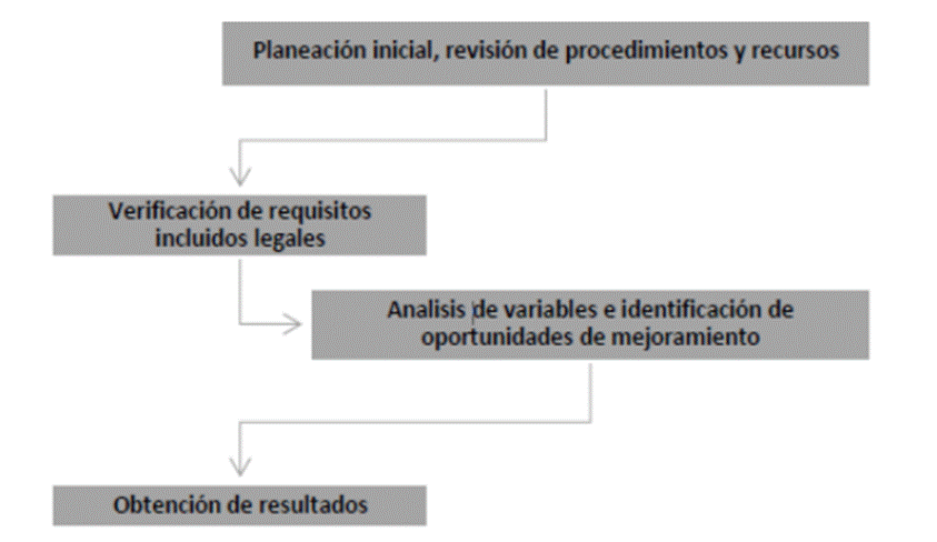 La figura 4 muestra un esquema estructurado en etapas, que comienza por la planeación inicial y la revisión de procedimientos y recursos. Esta etapa es de definición, por lo tanto, conlleva el diagnóstico de las necesidades en un escenario inicial, en términos energéticos y en función de los procedimientos para su gestión y manejo 18. Aquí son definidas responsabilidades para el recurso humano, incluidas aquellas relacionadas con la alta dirección, que tiene un grado de responsabilidad amplio en el funcionamiento del sistema. Es designado un presupuesto inicial para la administración de los recursos proyectados en la estructuración de procedimientos optimizados y mejorados 19. El análisis de factores internos y externos es esencial porque repercute directamente en decisiones estratégicas, uso de tecnologías, disposiciones y alcance 20.