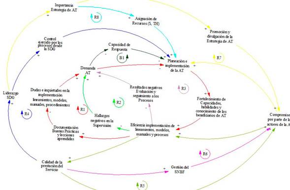 Finalmente, de acuerdo con las necesidades de las partes interesadas y la caracterización de la asistencia técnica que se realizó mediante la revisión de documentos del ICBF, se modeló cualitativamente su desarrollo mediante la aplicación de la metodología de dinámica de sistemas, para lo cual se construyó un diagrama de ciclos causales en Vensim P.L.E. 8.0.4. Este diagrama permite analizar y estudiar la problemática que se presenta durante la gestión de la asistencia técnica en el ICBF, ya que relaciona las interacciones y causalidades entre las variables del sistema.