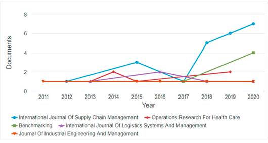 La revista International Journal of Supply Chain Management lideraba las publicaciones. Sin embargo, en el año 2020, esta publicación fue descontinuada. Las estadísticas muestran que las cinco principales revistas han publicado 45 de los 123 artículos, es decir, aproximadamente un 37 % de los trabajos publicados. La Figura 4 muestra las principales revistas en las que se publicaron estos artículos.